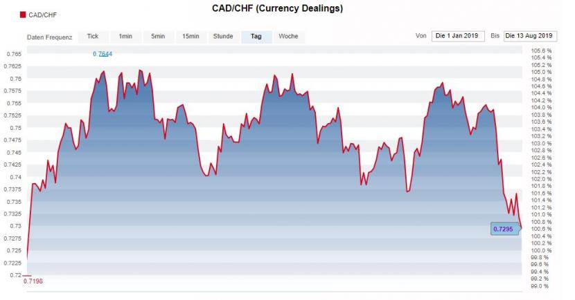 | Währung | Kurs zum Franken | Entwicklung seit 1.1.19 |