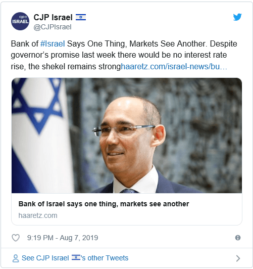 In einer Zeit, wo Notenbanken Zinsen eher senken als anheben, blieb diese Ankündigung nicht ohne Effekt: Der Schekel wertete stark auf. Das gefiel dem seit Dezember 2018 amtierenden Notenbankchef Amir Yaron nicht. Ende Juli ruderte er zurück und kündigte an, dass es dieses Jahr keinen Zinsanstieg mehr gebe und gleichzeitig Gegenmassnahmen getroffen würden, sollte sich der Schekel weiter aufwerten. Genützt hat es bislang wenig.