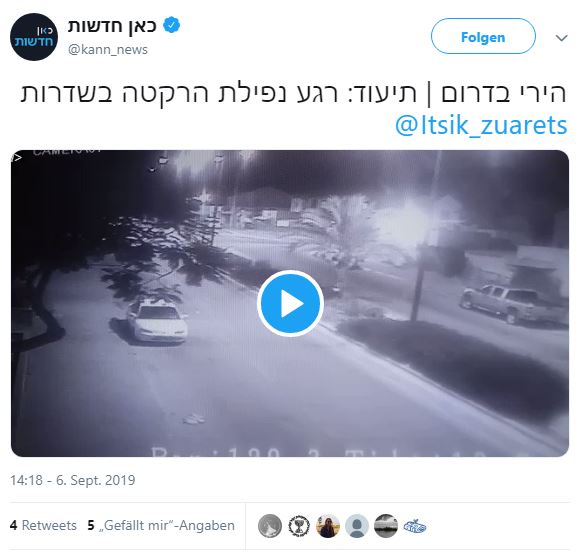 Gestern Mittag wurde ein israelisches Militärfahrzeug mit einem Sprengsatz angegriffen, der von einer Drohne der Hamas abgeworfen wurde. Das Fahrzeug wurde beschädigt, verletzt wurde auf israelischer Seite jedoch niemand. Ein israelischer Armeesprecher erklärte, dass Flugkörper der israelischen Armee daraufhin die Terroristen, die die Drohne gestartet hatten, angegriffen hätten. Die Drohne selbst sei allerdings unbeschadet in den Gazastreifen zurückgekehrt.