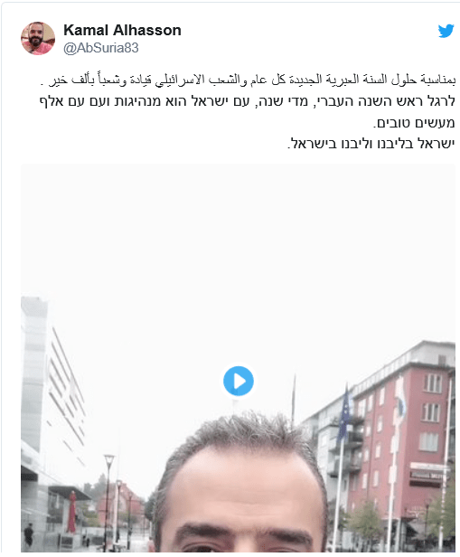 Kamal Hasson ist ein syrischer Regisseur und Autor, der im schwedischen Stockholm lebt. Er gehört der syrischen Opposition an, das ist auch der Grund, warum er nach Schweden ins Exil ging. Auf seinem Twitter-Account hat er nun geschrieben, dass viele Syrer dem israelischen Volk ein Frohes jüdisches Neujahr und einen Sieg über den Iran wünschen.