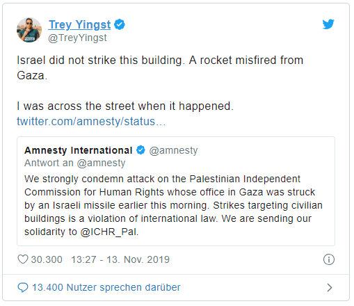 Damit antwortete er auf einen Post der von Amnesty International veröffentlicht wurde: „Wir verurteilen zutiefst den Anschlag einer israelischen Rakete auf das Gebäude der Palästinensischen Menschrechtskommission in Gaza an diesem Morgen. Angriffe auf zivile Gebäude verstoßen gegen das internationale Recht. Wir senden unsere Solidarität @ICHR_Pal.“