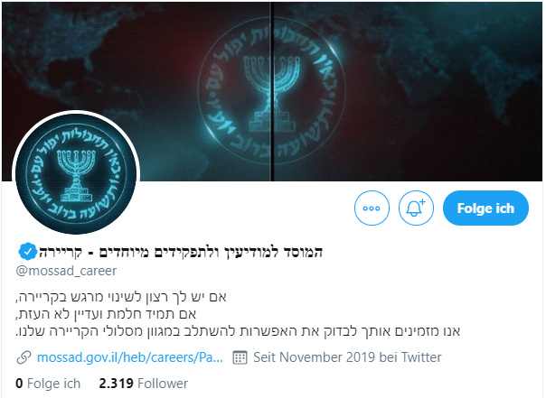 Hier können Sie Mossad’s Twitter-Account folgen. Dieses ist zwar auf Hebräisch, bietet aber eine Übersetzung an.