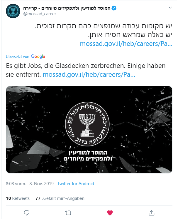 In ihrem zweiten Tweet richtete die Mossad den Fokus bereits auf die Karrieremöglichkeiten: „Wir haben Jobs, die Glasdecken zerstören. Einige davon wurden bereits entfernt.“ – “We have jobs that smash glass ceilings. Some of which have already been removed.”