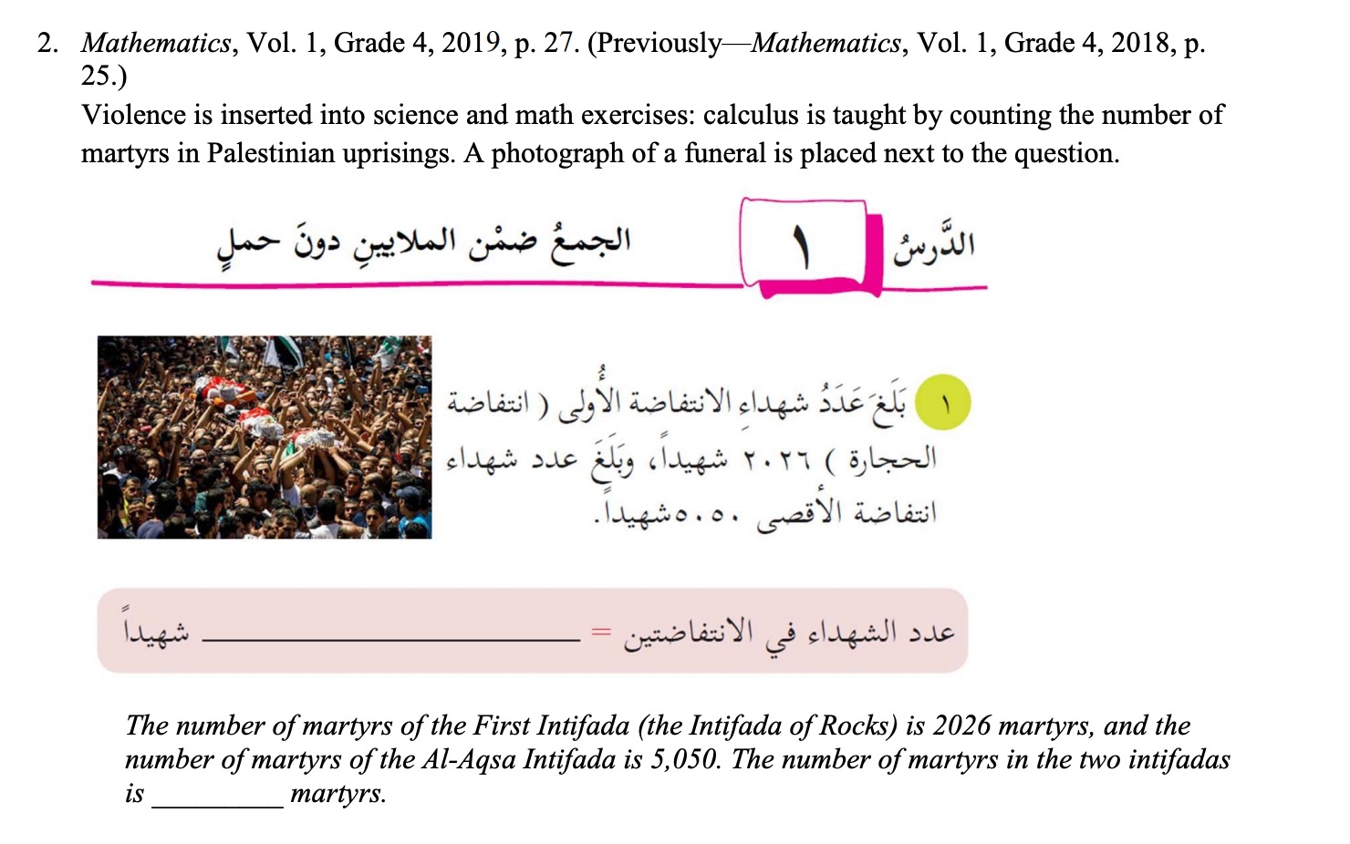Addition und Subtraktion im Buch der Mathematik zur vierten Klasse werden wir durch das Zählen der Märtyrer der Intifadas gelehrt.