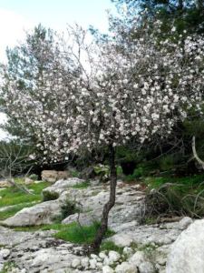 Jedes Jahr zu Tu Bischvat blühen im ganzen Land die Mandelbäume. Dieser Baum hat in der Schrift eine besondere Bedeutung für Tu Bischvat. Das hebräische Wort für Mandel ist Schaked, es bedeutet auch „schauen“ oder „wachen“. Der Mandelbaum ist einer der ersten im Jahr, der seine Blüten hervorbringt. Wenn die brillanten lila-weissen Blüten die Landschaft in Israel mit Leben erfüllen, ist es, als ob sie das Land zum „erwachen“ bringen, in dem sie das Ende ihres Winterschlafs verkünden.