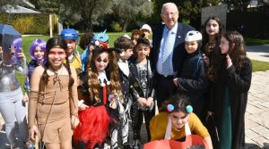 „Aber keiner von euch hat sich als Präsident verkleidet, oder ist jemand als der Sprecher der Knesset gekommen? Oder als Partei-Führer,“ fragte der Präsident die Kinder mit einem Augenzwinkern.