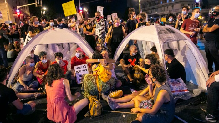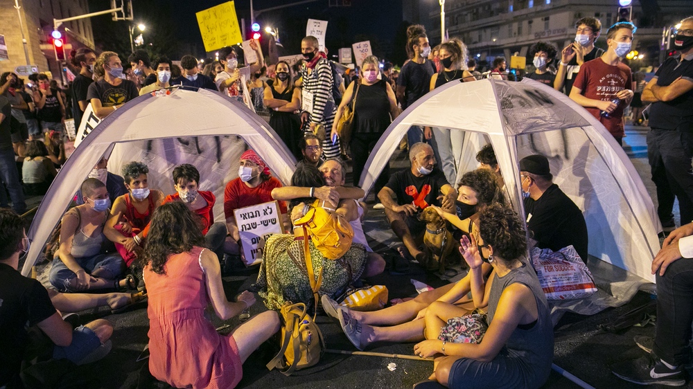 Fast gänzlich die Abriegelung ignorierend, kampierten linke Israelis vor Netanjahus Residenz, um ihn zum Rücktritt aufzufordern. (Foto: Olivier Fitoussi/Flash90)