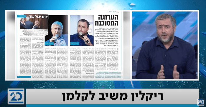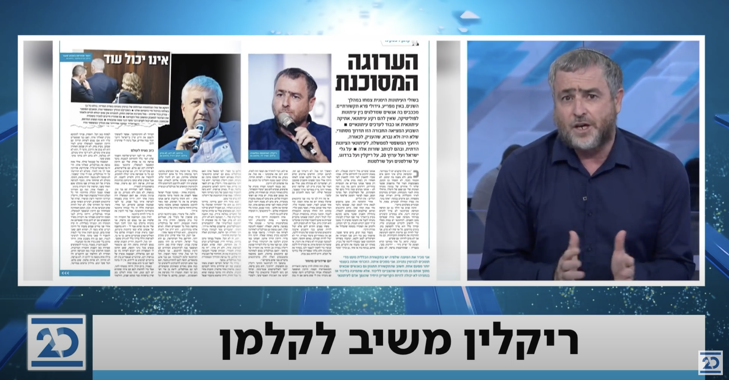 Die Hauptbühne wurde jedoch Shimon Riklin überlassen, der den gesamten rechten Fernsehkanal 20 auf seinen Schultern trägt. Riklin wartete bis nach dem Versöhnungstag, um seinen Gegenangriff auf Libeskind zu starten, der 16 Minuten seiner 45-minütigen Abendnachrichtensendung in Anspruch nahm, ein Spektakel, das so noch nie zuvor gegeben hat.