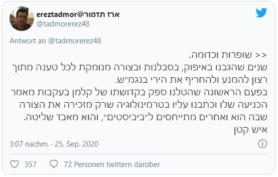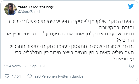 Das ehemalige Likud-Mitglied Yaara Zered tweetete: “Es stört Kalman Libeskind, dass ich Likud-Aktivistin war, und zu meiner früheren Tätigkeit als Journalistin zurückkehrte. Sagen Sie, haben Sie Kalman irgendetwas sagen hören über … (Shelly) Yechimovich … das passiert, wenn Kalman mit sich selbst beschäftigt ist, anstatt mit der grossen Story.“ (Yechimovich ist eine Journalistin, die in die Politik gegangen ist und dann doch wieder zu den Medien zurückkehrte.)