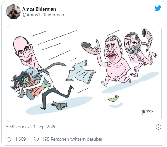 Die Karikatur zeigt Libeskind, wie er fröhlich mit den Kleidern von Yaakov Berdugo und Riklin wegrennt, die beiden, die er heftiger angegriffen hat als alle anderen. Die Shofar-Hörner, die die beiden in der Hand halten, verweisen auf die Art und Weise, wie israelische Medien rechte Journalisten nennen. Sie sind Shofars, das heisst, sie sind Instrumente, Marionetten von Netanjahu, die seine Botschaften nur verstärken.