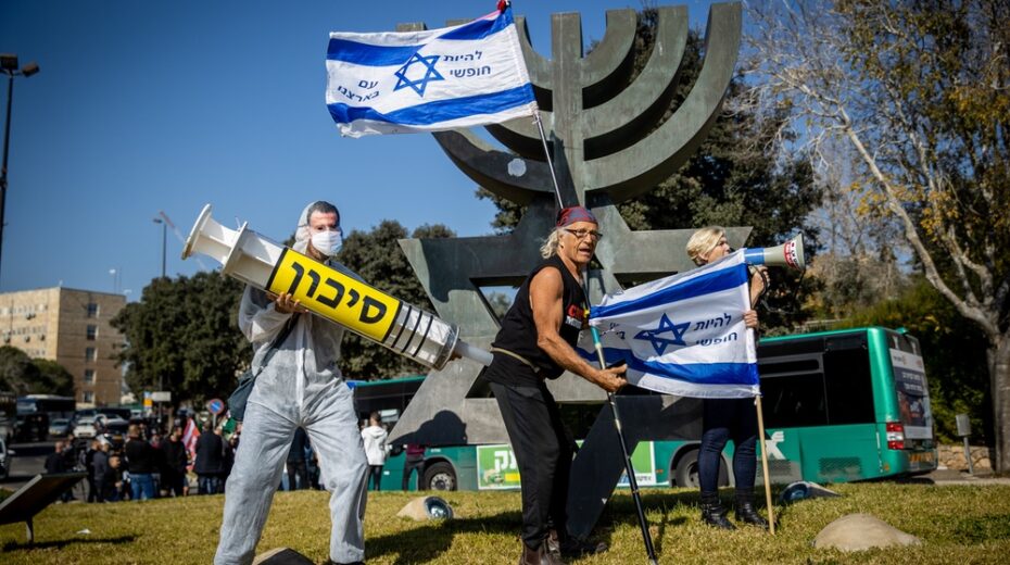 Eine Gruppe von Israelis versammelte sich am 4. Januar 2021 vor der Knesset, um gegen die Impfung der Bevölkerung gegen COVID-19 zu protestieren.