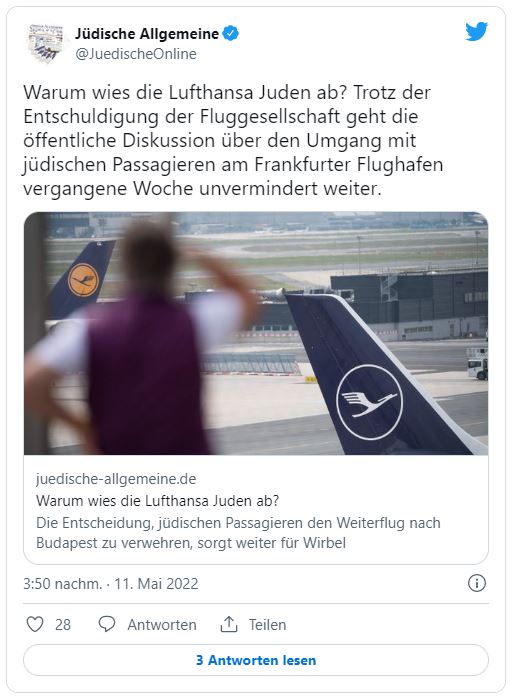 Der Vorstandsvorsitzende der Lufthansa, Carsten Spohr, hat sich am Mittwoch beim Berliner Rabbiner Yehuda Teichtal für den Vorfall am Frankfurter Flughafen entschuldigt. Am 4. Mai waren dort mehr als 100 ultraorthodoxe Juden kollektiv vom Weiterflug nach Budapest ausgeschlossen worden, weil es auf dem vorangegangenen Flug von New York bei einigen zu Problemen mit der Einhaltung der Maskenpflicht gekommen war.
