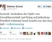 „Der o. g. Tweet hatte und hat nicht die Absicht, das Gedenken der Opfer von Gewaltherrschaft und Krieg in Mitleidenschaft zu ziehen oder gar zu diskreditieren“, so Schulz in seiner Klarstellung. „Dies gilt insbesondere auch für die Opfer des Nationalsozialismus in Deutschland, Europa und der Welt.“ Auch die Vorwürfe antisemitistisch zu sein oder zu fördern, wies Schulz in dem Schreiben weit von sich.